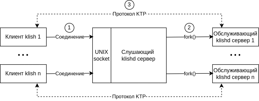 Проект klish использует клиент-серверную модель. Слушающий сервер klishd загружает конфигурацию команд и ожидает запросов от клиентов на UNIX-сокете (1). При соединении от клиента слушающий сервер klishd порождает (fork()) отдельный процесс (2), который будет заниматься обслуживанием одного конкретного клиента. Порожденный процесс называется "обслуживающий сервер klishd". Слушающий сервер klishd продолжает ожидать новых соединений от клиентов. Взаимодействие между клиентами и обслуживающим сервером происходит по UNIX-сокетам с использованием специально разработанного для этой цели протокола KTP (Klish Transfer Protocol) (3).