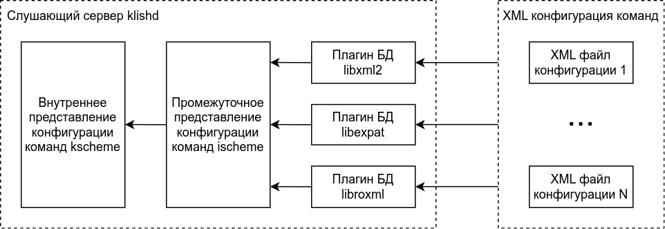 В составе klish (см. dbs/) существуют следующие плагины баз данных для загрузки конфигурации команд, т.е. схемы: